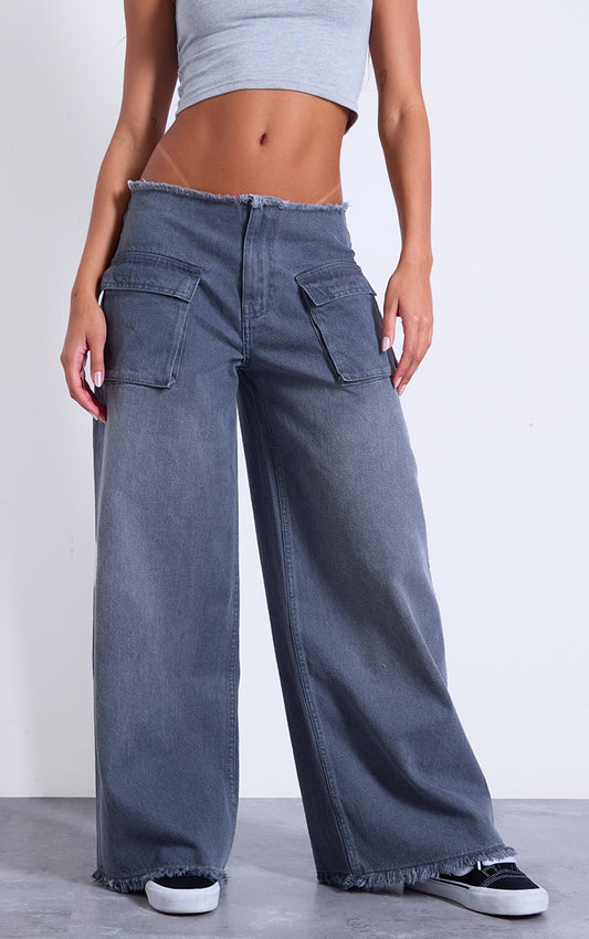 Grey Pocket Detail Frayed Hem Wide Leg Jeans Next Day Delivery Before 10 pm