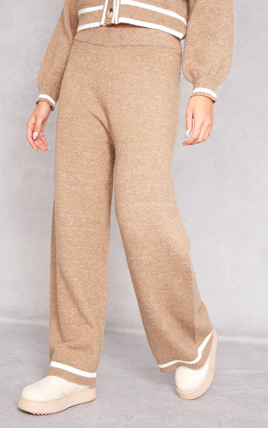 Taupe Soft Knit Contrast Stripe Detail Wide Leg Trousers Next Day Delivery Before 10 pm