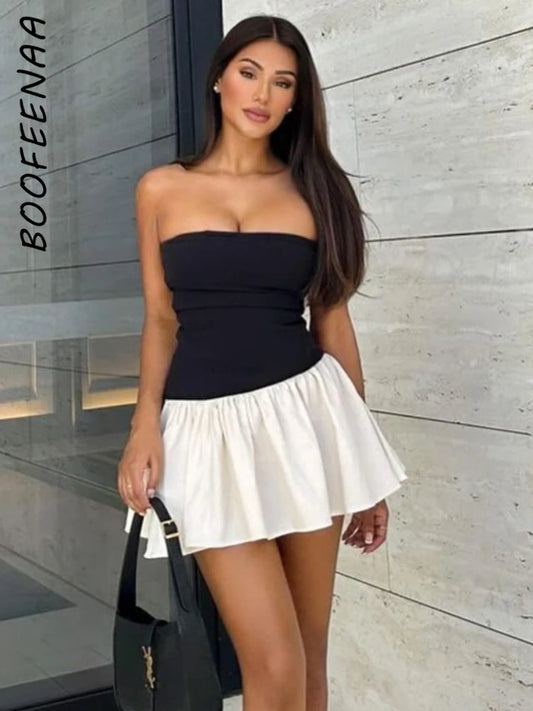 BOOFEENAA Black and White Patchwork Strapless Short Dresses for Womens Clothing 2024 Sexy Summer Dress Resort Wear C83-BB19