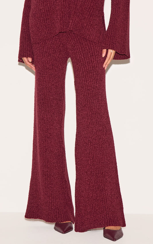 Burgundy Rib Boucle Knit Wide Leg Trousers