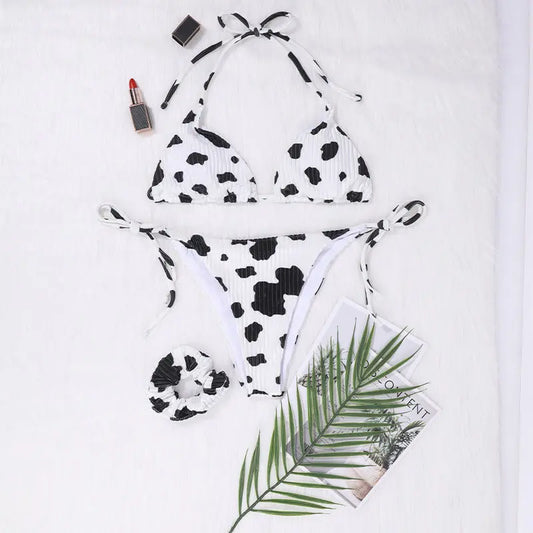 Bikini New Cow Pattern Lace up Split Swimsuit Women's European and American Lace up Open Back Sexy Bikini