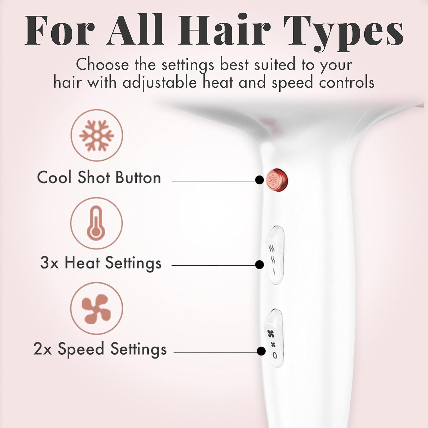 - SALON-QUALITY RESULTS AT HOME - Experience shine, softness, & control like never before and add elegance to your vanity with our powerful white blow dryer with rose gold trims