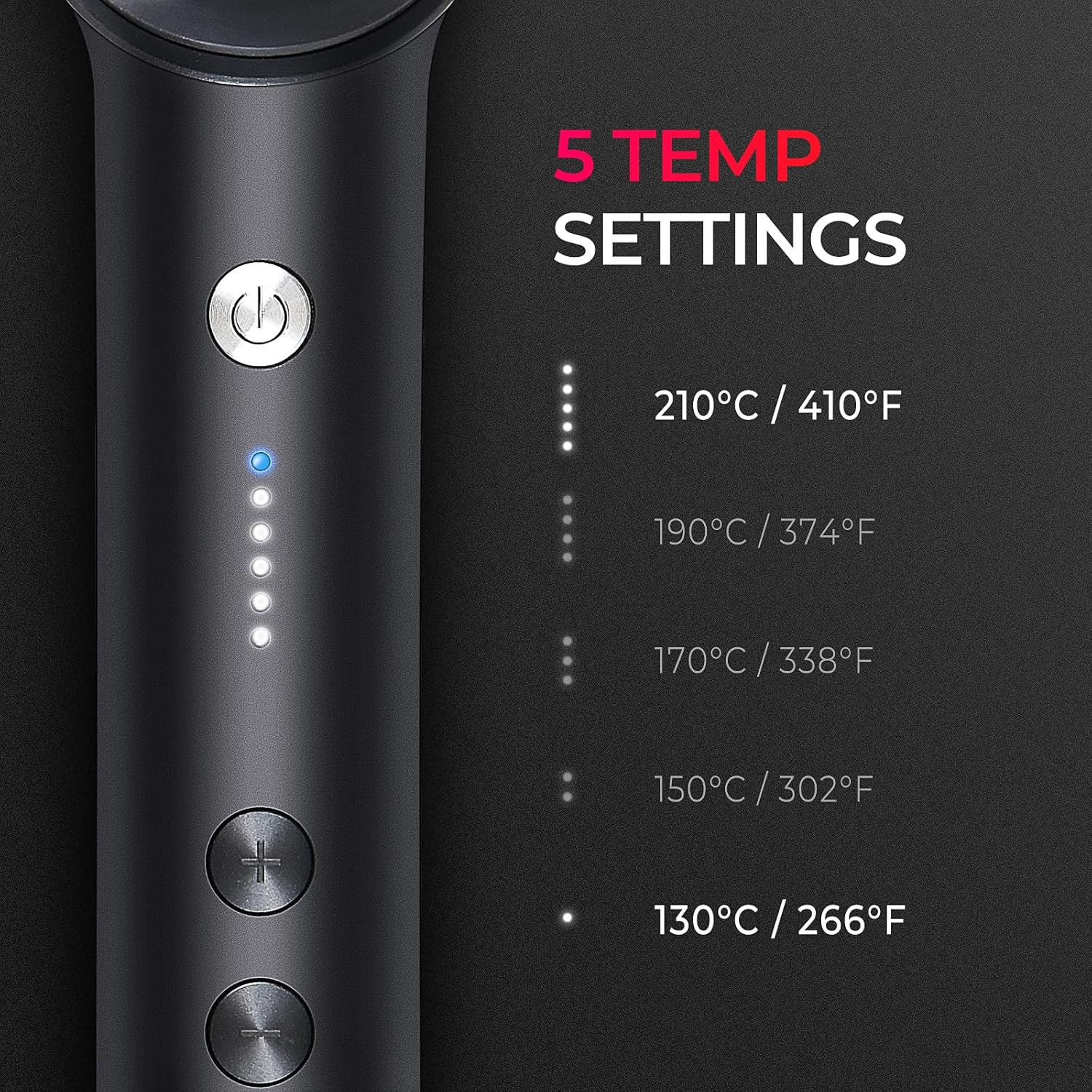 - 5 TEMPERATURE SETTINGS - 130°C, 150°C, 170°C, 190°C, 210°C (heats up to 170°C in about 20 seconds and up to 210°C in about 40 seconds under room temperature)